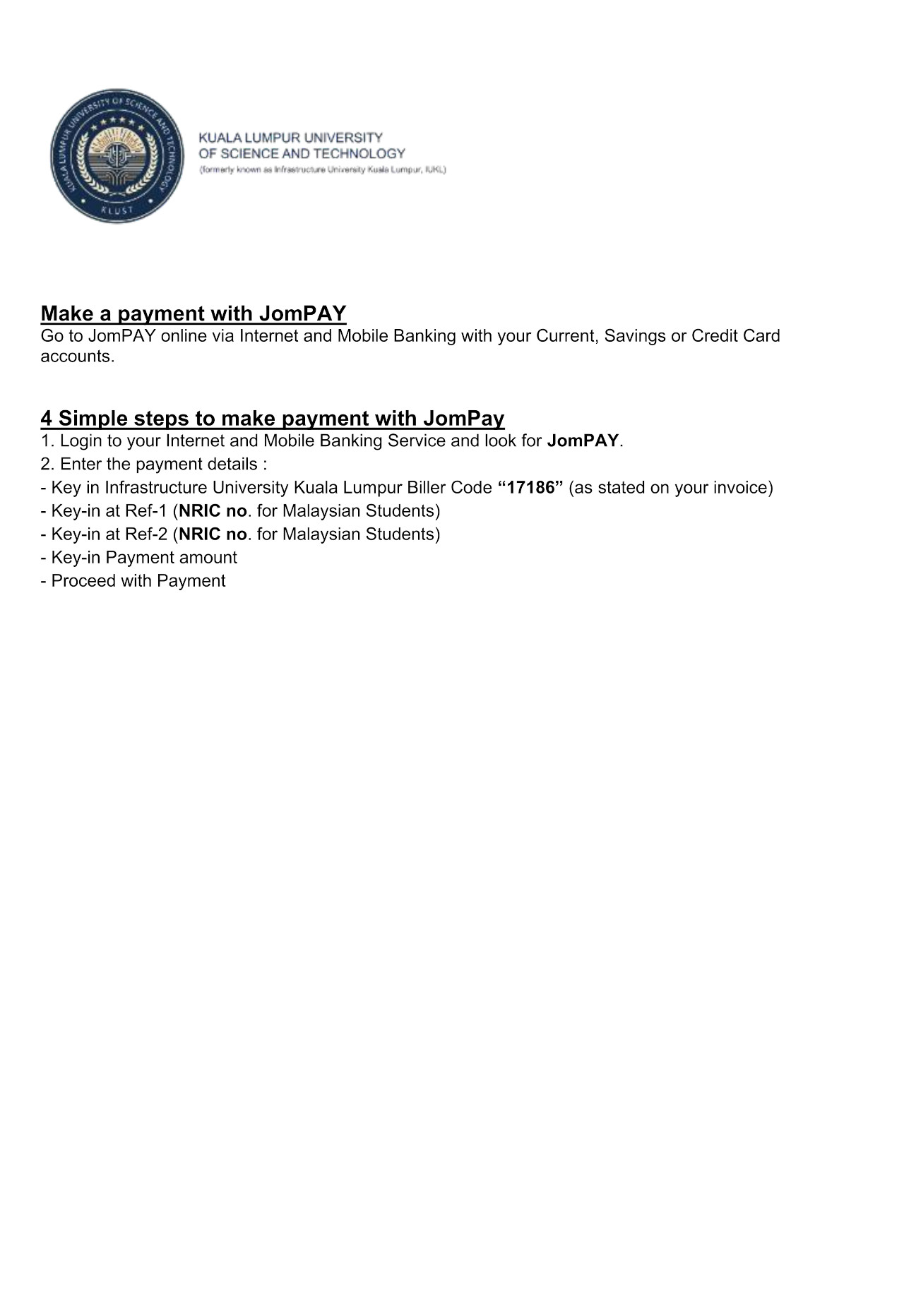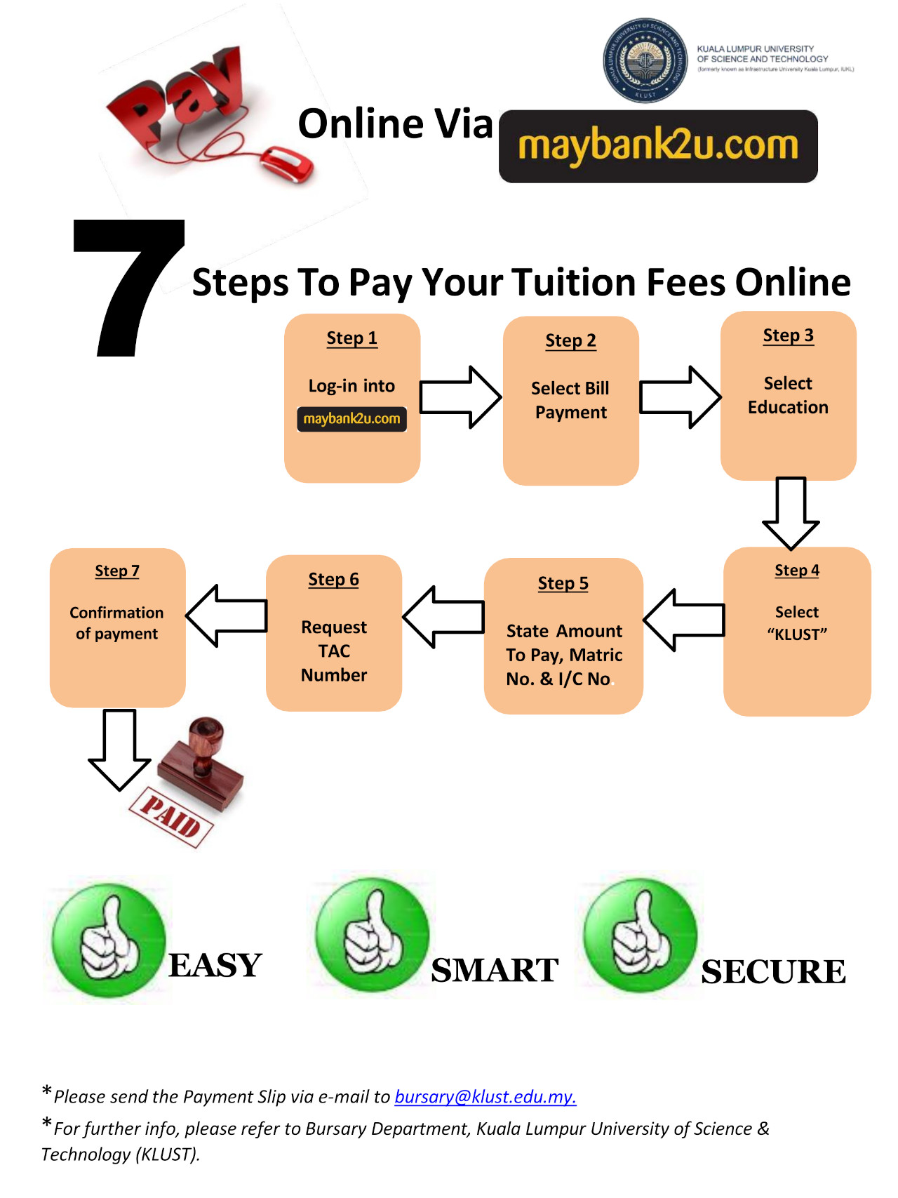 Maybank2u.com.my under the Payee Corporation Name “KLUST”